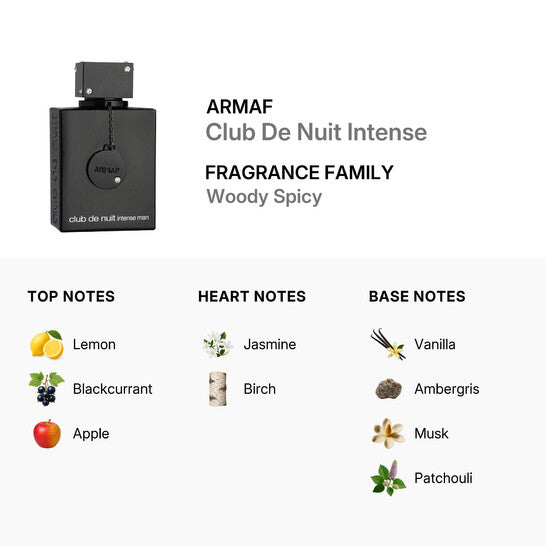 A medida que la fragancia evoluciona, revela sus notas de base, una mezcla cálida y acogedora de vainilla, ámbar gris, almizcle y pachuli. Estos tonos profundos y terrosos proporcionan una base sólida que permanece en la piel, haciendo de Club De Nuit Intense una opción perfecta para el clima fresco y eventos nocturnos. Sin embargo, su versatilidad también la hace adecuada para cualquier estación y una variedad de ocasiones, desde salidas informales hasta reuniones formales.